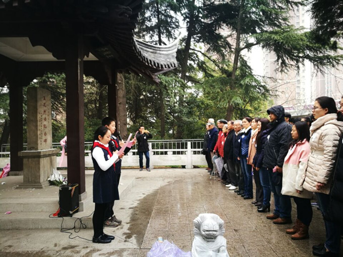 清明雨中寄哀思,继往开来谱新篇。2017年3月30日下午2时,中共江苏大学离退休党工委、江苏大学关心下一代工作委员会、中共象山街道江大社区党总支委员会在王龙亭举行王龙烈士悼念仪式。退管处全体工作人员、部分离退休党员、江大社区部分党员约40多人参加了悼念仪式。离退休党工委书记叶伟主持了悼念仪式。